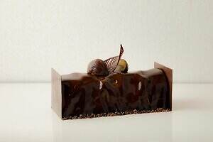 「丹波栗とチョコレートのブッシュ」は、光沢のあるグラサージュショコラに包まれた重厚な佇まいが印象的。内部は6層仕立てになっており、豊かな甘みの丹波栗を中心に、なめらかなチョコレートムース、カシスを組み合わせている。栗の存在感を際立たせつつも、ショコラの深みとカシスの爽やかさが絶妙なバランスを生み出す。