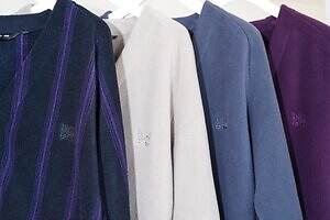 カラーは、ブラックとパープルのストライプ柄から、無地のグレー、ベージュ、パープルまでの4色を展開する。
