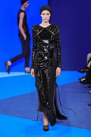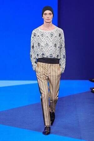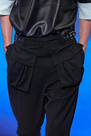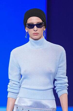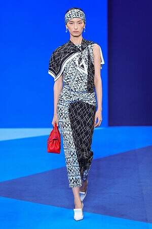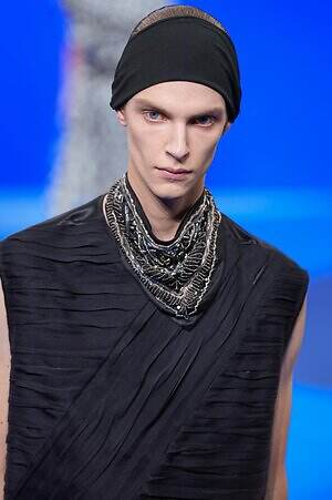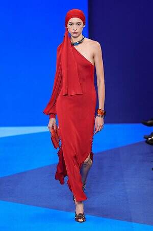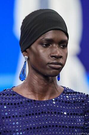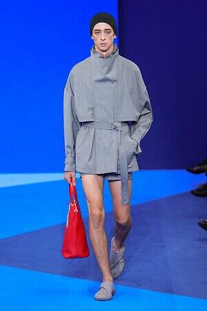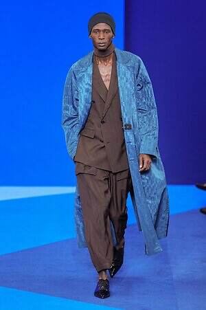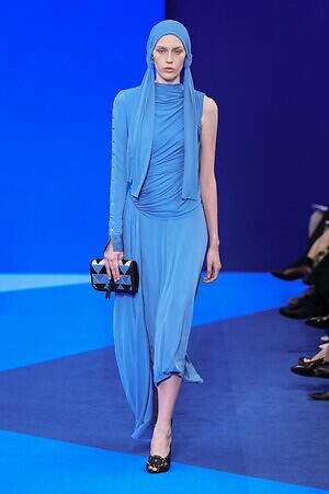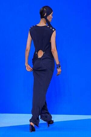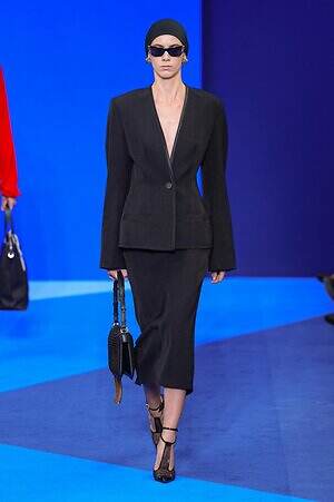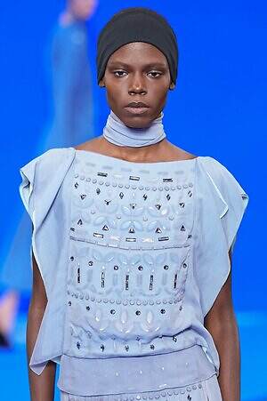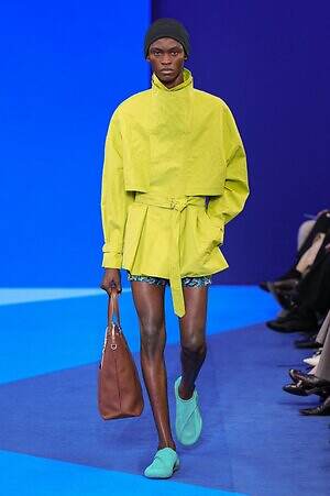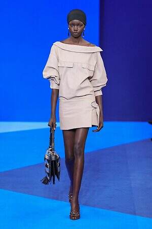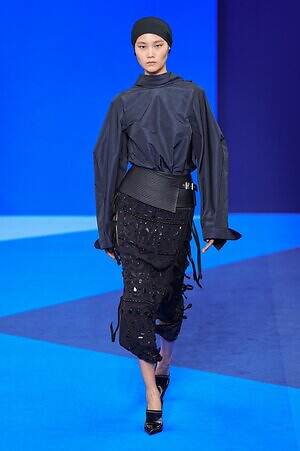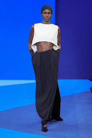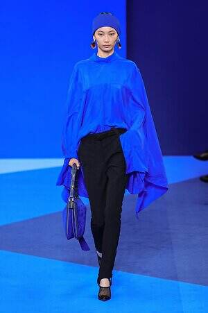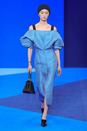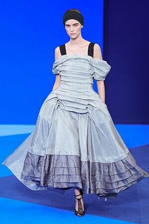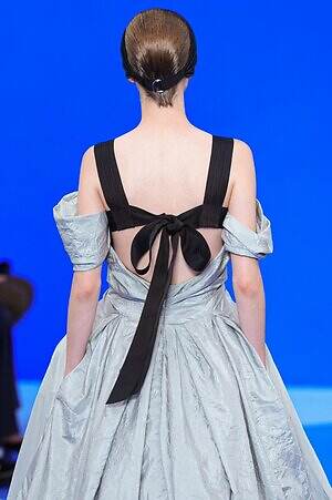 創業者ジャンヌ・ランバンの愛した深い青、"ランバン・ブルー"の光に包まれてショーは幕を開けた。登場したのは、流麗なドレスやテーラリングを中心とした、気品溢れるオケージョンルック。開放的なカッティングや素材使いにより、荘厳と言うよりはむしろ、軽やかなムードに引き寄せている。