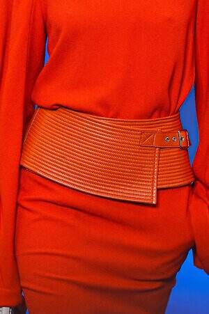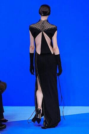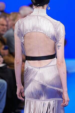 隙のないように見える首の詰まったテーラードジャケットやタートルネックは、バックを大胆にカッティングし、素肌を覗かせているのが新鮮。多彩なバリエーションで展開されたドレスも、オフショルダーやワンショルダーで仕立てたり、深いスリットを入れたりと、開放的な肌見せデザインが散見された。
