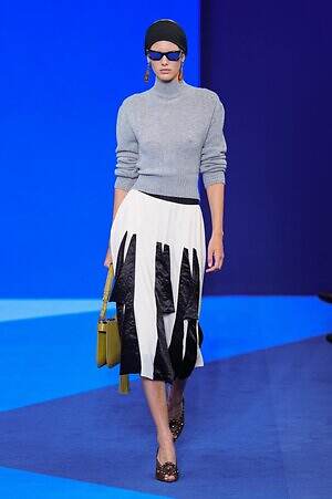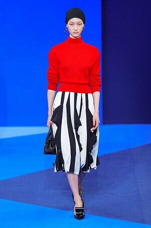 コレクションに軽快なリズムを加えるのが、揺れるディテールである。とりわけ目を引いたのが、フリルのパーツを配したストライプスカート。布地の動きに合わせてパーツが左右に踊り、躍動感のある幾何学模様を生んでいる。