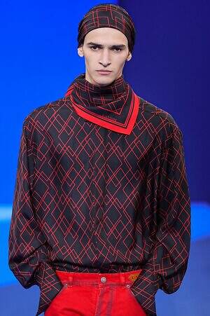 風を受けて悠然と流れる、しなやかな素材使いもポイントだ。首に巻いたスカーフは動きとともに優雅に舞い、ランバン・ブルーの布地を贅沢に使ったブラウスはマントのように翻る。しっとりと艶めくシルクサテンのガウンやシャツは、身体のフォルムと溶け合いながらエレガントに流れている。