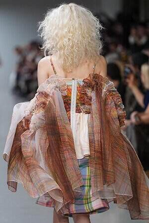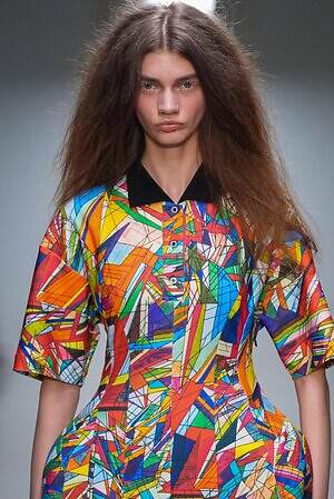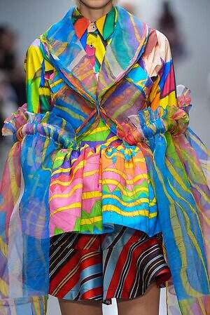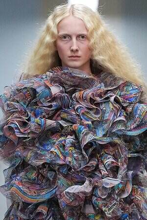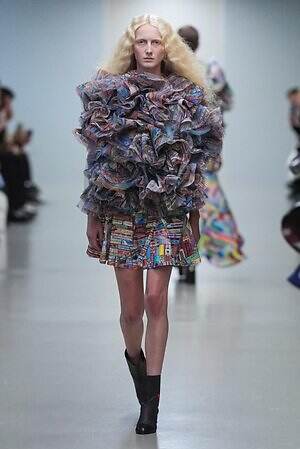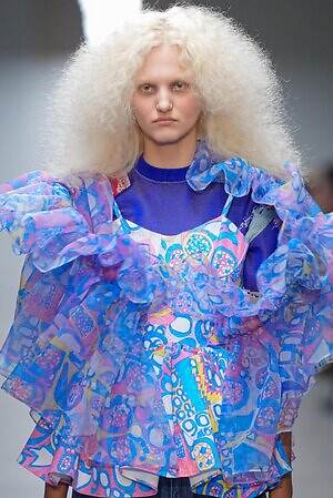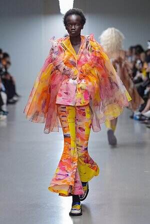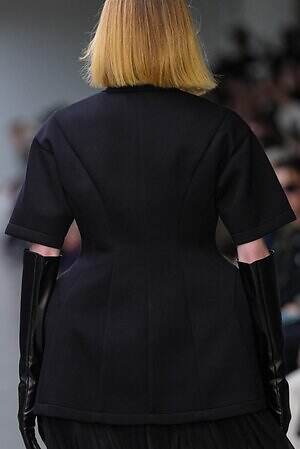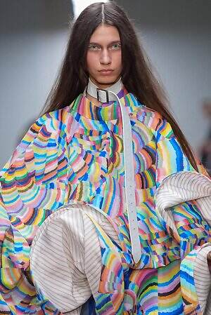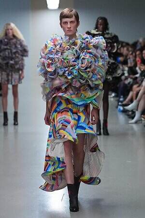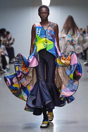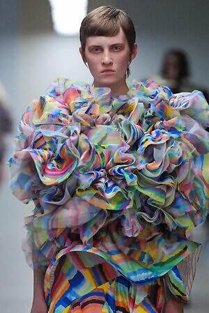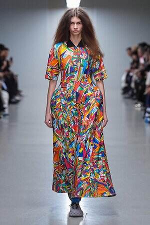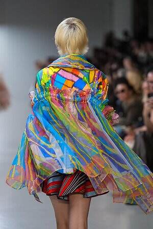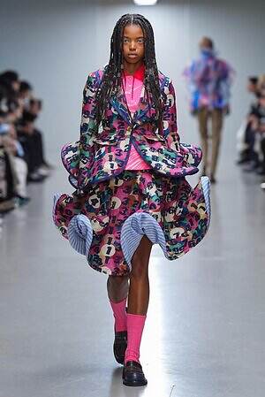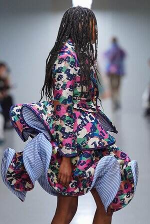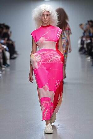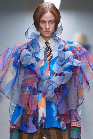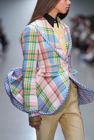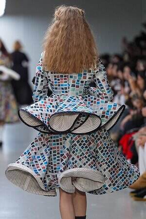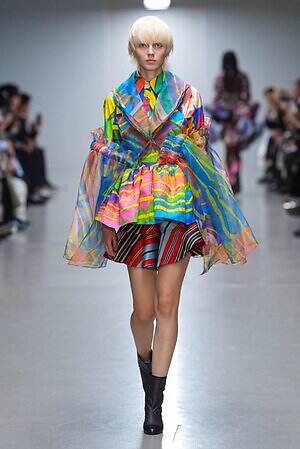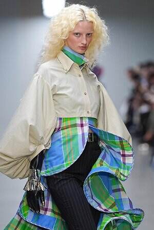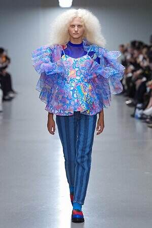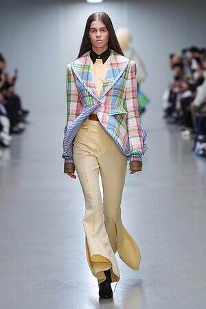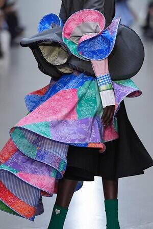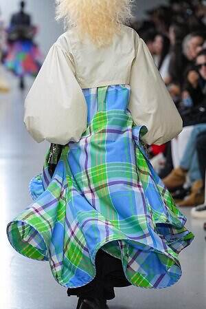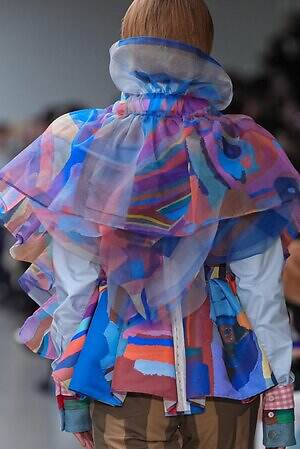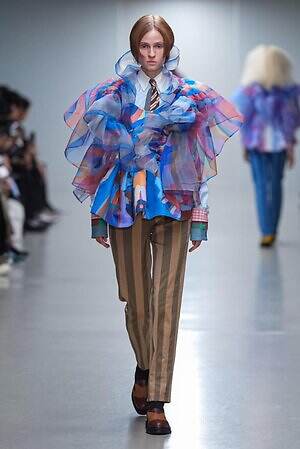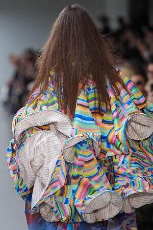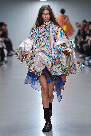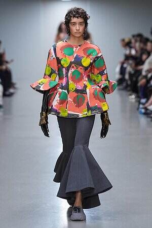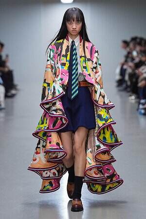 学校の制服をイメージしたピースも散見されたが、そのどれもが超構築的なシルエットで再解釈されている。胸に紋章を配したブレザーはヘムラインを曲線的にカッティングし、バックスタイルにかけてぐるぐると渦巻くようなデザインに。ストライプシャツは空気を包み込むようなバルーンスリーブ、ポロシャツはウエストから立体的に膨らんだベル型のシルエットに仕立てている。