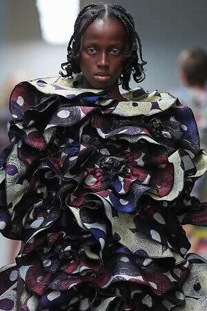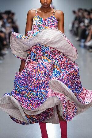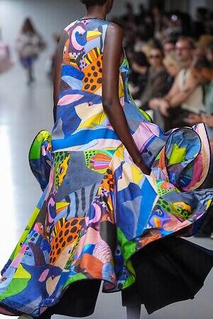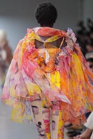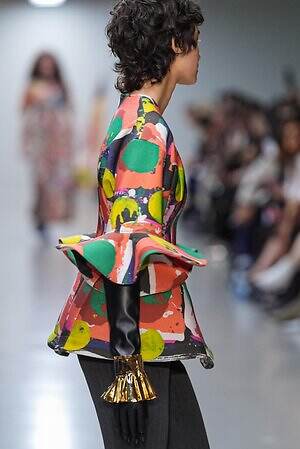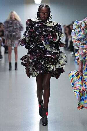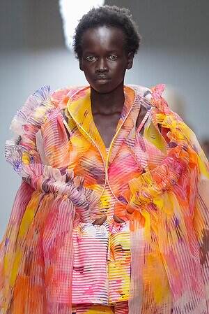 キーピースとなるのは、“生き物のように動く服”。贅沢にフリルをあしらったドレスは鼓動のリズムに合わせてフリルも脈打ち、花弁のように構築的なフォルムに仕立てたブルゾンは、そのフォルムを形作る骨組み自体がうねっている。歩みとともに揺れる、風を受けてはためくといった受動的な動きとは別に、洋服自体が意志を持って踊っているのだ。