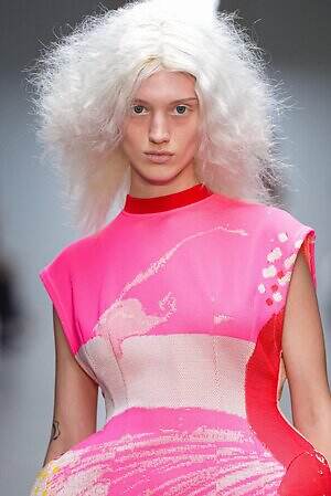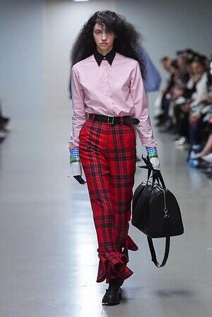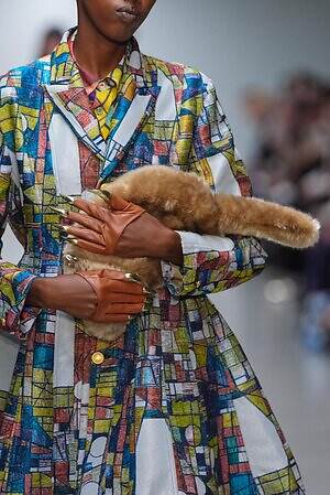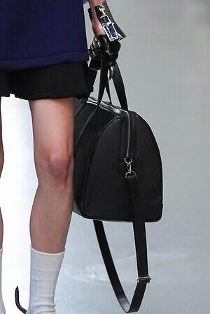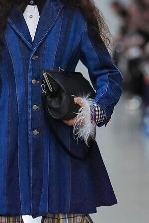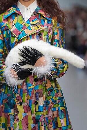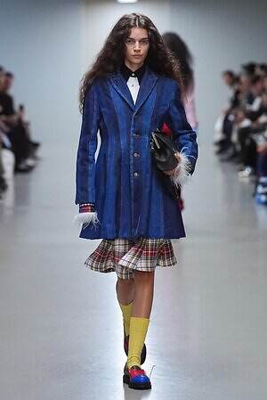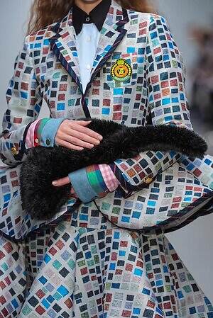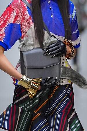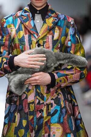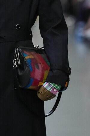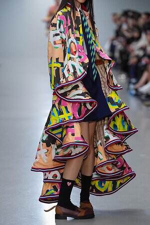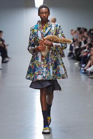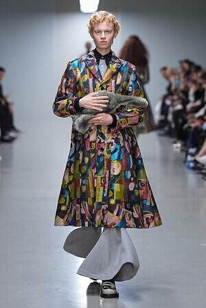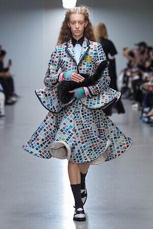 服を液晶スクリーンに見立てた先シーズンの技術を応用し、黒のボストンバッグには動く絵文字をオン。まるでスマートフォンの画面をそのまま落とし込んだように、ハートや目の絵文字が点灯する。シューズからも同様に、ハートの絵文字を映し出したブーツが登場。ローファーは耳と尻尾を付け、架空の動物のような姿に変貌させた。