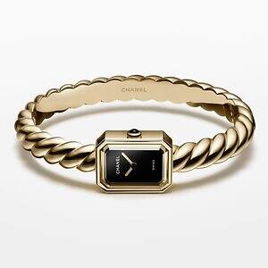 シャネル(CHANEL)の「プルミエール ガロン」は、メゾンのファッションでなじみ深いシグネチャーの1つ「ブレード(縁取り)」を再解釈した新作ジュエリーウォッチ。ツイストしたブレードを18Kイエローゴールドのバングルに、シンプルな八角形ケースダイヤルを組み合わせた。
