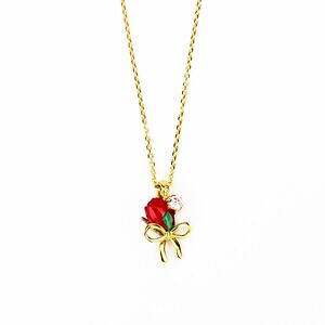 キャス キッドソン(Cath Kidston)の「リボンフローラル」シリーズは、赤いローズの蕾にリボンパーツを添えた大人かわいいジュエリー。ネックレスは、K18イエローゴールドのコーティングを施したチェーンを用いて、華奢に仕上げた。