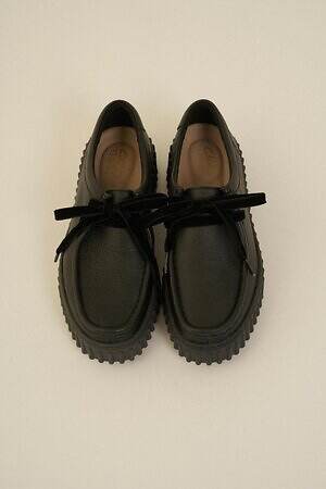 コラボレーションシューズのベースとなっているのは、クラークスの「トーヒルビー」。クラークスのアイコンシューズ「ワラビー」のアッパーに、「ビッググリッパー」のチャンキーソールを組み合わせた1足だ。ギザギザとしたリブを刻んだ厚底が、ボリュームのある佇まいを見せる。