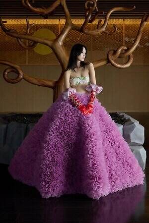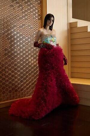 トモ コイズミを象徴する、ラッフルを組み合わせたドレスが勢揃い。繊細なライラックカラーと柔らかなアイボリーのラッフルを合わせた、ふんわりと広がるドレスをはじめ、煌びやかな刺繍と深紅のラッフルがエレガントなドレスや、澄み渡るブルーのラッフルがひときわ目を引くドレスなどがラインナップする。