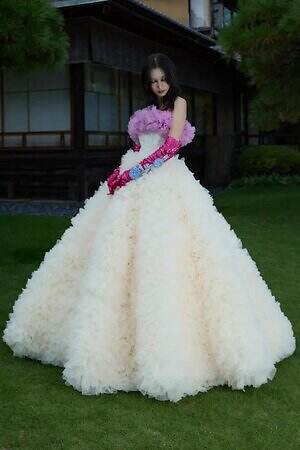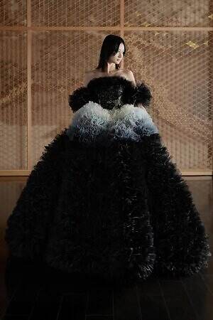 「スタジオ コク(STUDIO KOKU)」をイメージしたドレスは、シックなブラックを基調にグラデーションやきらびやかな刺繍を織り交ぜたデザインに。一方、「ホール ハク(HALL HAKU)」からインスパイアされたドレスは、繊細に折り重ねたラッフルが際立つ純白のウェディングドレスとなっている。