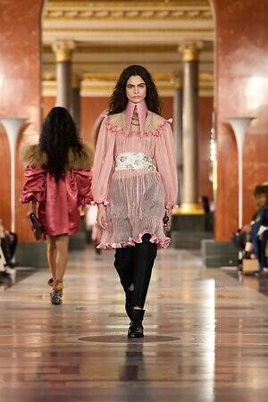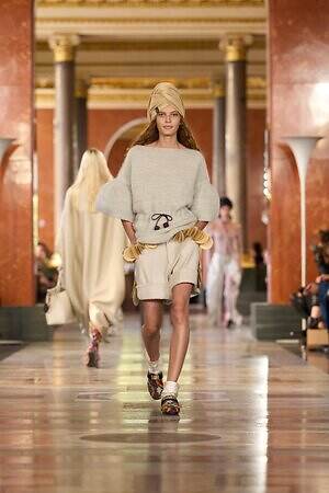シルエットは柔らかく曲線的なものが中心。ふっくらと丸みを帯びたドロップショルダーのニットに、フリルが揺れるパニエ風スカートを合わせたルックがその好例だ。このほかにも、すっぽりと身体を包み込むケープ、ベビーピンクの卵型スカート、風を受けて膨らむよう布をレイヤーしたバルーンパンツなどが登場し、穏やかなムードを演出した。