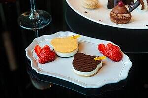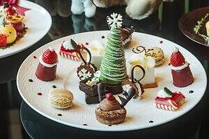 スイーツプレートは、煌びやかなクリスマスツリーを中心に、プレゼントボックスを思わせるホワイトチョコとピスタチオのムースや、トナカイのチョコレートケーキ、苺をサンタ帽に見立てたカシスカヌレ、オレンジ風味のオーナメントクッキーなどが取り囲む。幸福感たっぷりのファミリークリスマス表現した1皿だ。