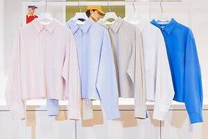コラボレーションの定番「オックスフォードシャツ」には、2025年秋冬の新色として、明るいトーンのピンクストライプ、ベージュストライプ、ブルーストライプ、そして色鮮やかなブルーの無地を追加。厚みがあり高級感のある生地で、立体的なシルエットを叶えてくれる。