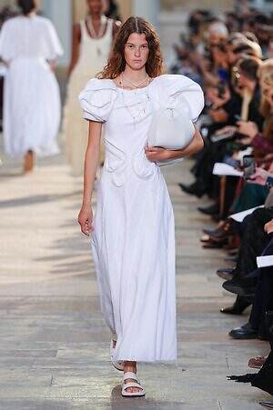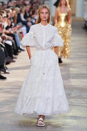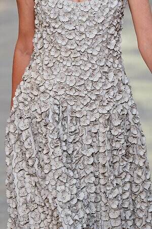 全体を通して、女性らしさを際立たせるドレスルックが中心。多彩な素材とクラフト技術で、バリエーション豊かに提案しているのが特徴だ。