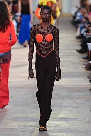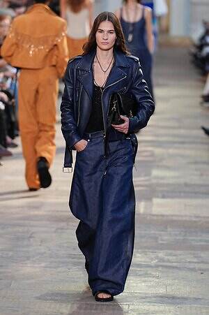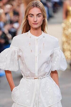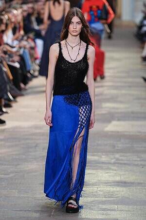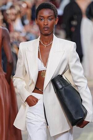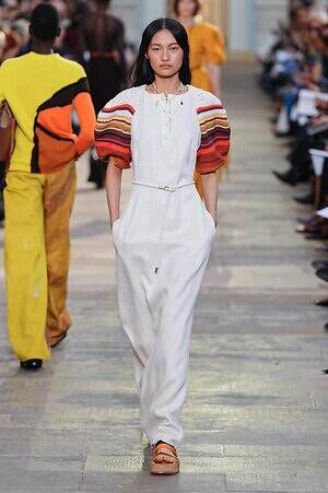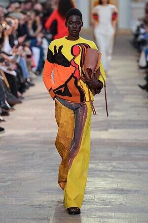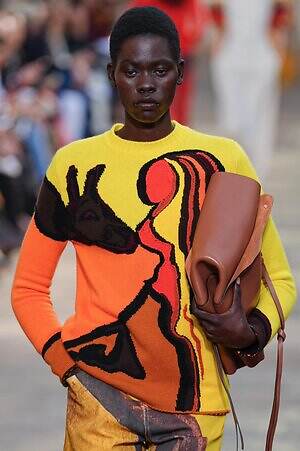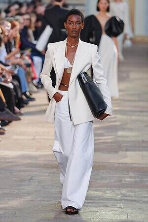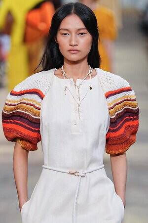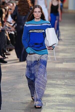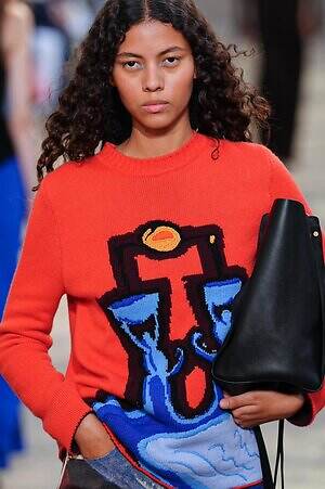 カラーは、ホワイトやブラックといったベーシックなパレットに、目の覚めるような原色をプラス。中でも今季の色彩をアイコニックに表現しているのが、コレクションのすべての色を組み込んだガブリエラの手描きの絵からインスピレーションを得たニットやデニム。鮮烈なレッドやイエロー、ブルーなどで彩られた抽象的なドローイングにより、“着るアート”のような佇まいに仕上げた。
