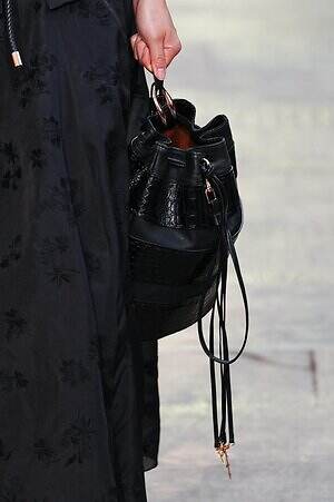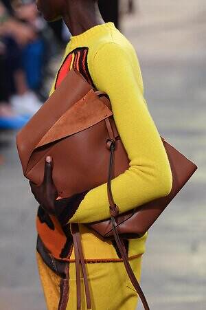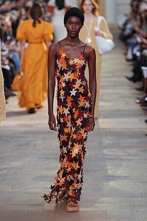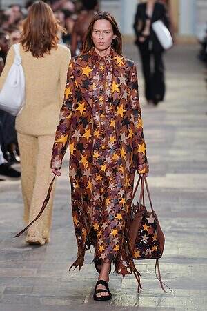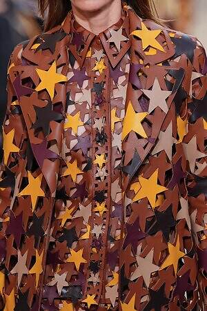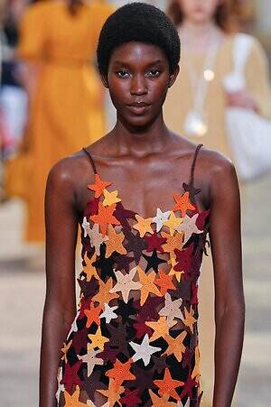多彩なドレスが登場する中でもひときわ目を引いたのが、さまざまなサイズのマルチカラーのスターパーツで構成された「THE STAR(星)」のニットドレス。パーツはひとつひとつ編み上げられ、手作業で床までの長さに繋ぎ合わされている。このほか、1,200個ものレザーの星で組み立てられたドレスやコート、トートバッグなども提案された。