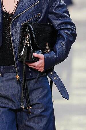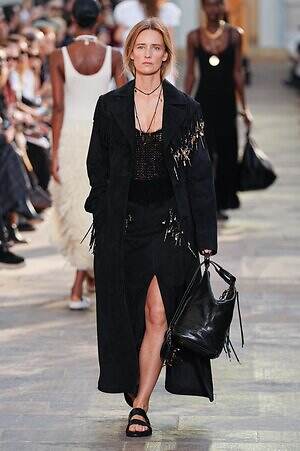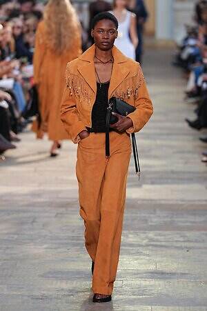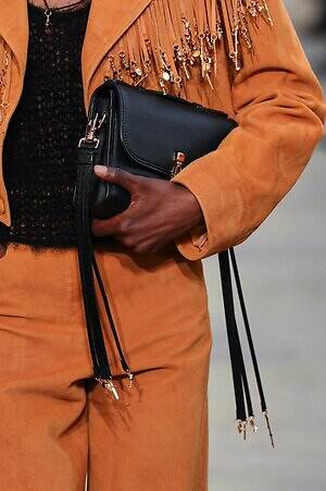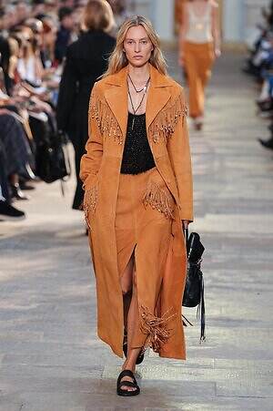 タロットカードの4つの種類であるディスク、カップ、ワンド、剣を描いた金メッキのチャームと、「DEATH(死神)」を象徴するスカルチャームは、コレクションに華やかさをプラスするポイント。カシュースエードのコートやスカートのフリンジに手作業であしらわれ、マットな質感の上に煌めきを与えた。モデルが歩みを進めるたび、鈴のようにシャンシャンと鳴り響き、聴覚からもアクセントを添えている。