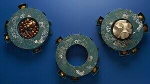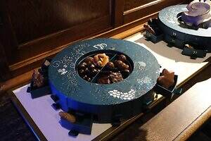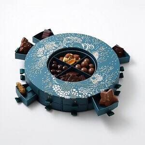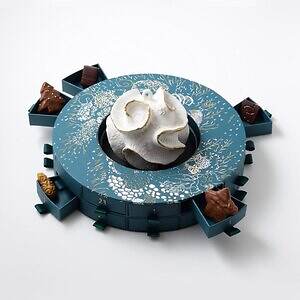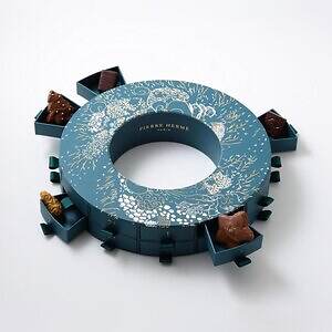 サークル状のボックスの側面に引き出しを配し、ショコラやサブレなどを詰め合わせた毎年恒例のアドベントカレンダー。ブルーを基調に、彩りあふれる泡の模様の優美なレリーフやゴールドの装飾を施したボックスにうっとりしながら、クリスマスまでの日々をカウントダウンすることができる。24個入と、円の中央にも引き出しを備えた28個入、うねうねと曲がった珊瑚礁のオブジェ付きの3種が展開される。
