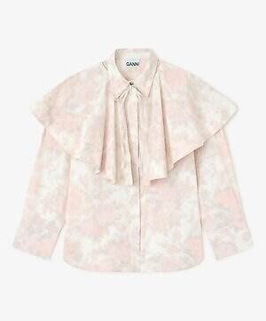 中でも注目は、柔らかなドレープを描くケープ付きのシャツ。淡いピンクカラーの繊細な花柄プリントを散りばめ、フェミニンなムードに仕上げた。襟元に配した細めのリボンもポイントだ。