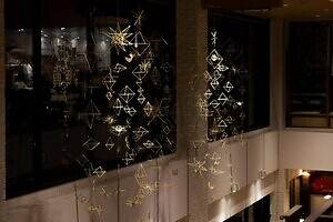 マーケットホールの室内には、リトアニアの伝統装飾「ソダス」を展示。多面体や星、雪をかたどったモチーフが連なり、空気に揺れる姿が冬空を思わせる。北欧の工芸美を活かした装飾が、屋外・屋内それぞれに広がる。