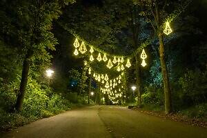 見どころは、2024年に引き続き登場するイルミネーション「天空のヒンメリロード」。フィンランドの伝統工芸「ヒンメリ」をモチーフにした大小100個の立体オーナメントが並木道を彩り、光に照らされた幻想的な空間が広がる。3回目となる今回はエリアを拡大し、より広い範囲で楽しめる。