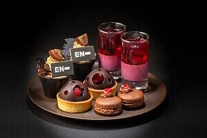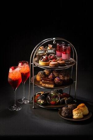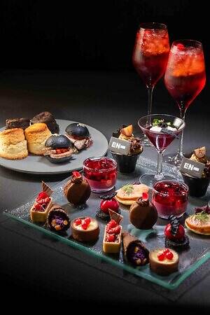 「エンチャンテッド・バイト」は、ENHYPENから切っても切り離せないコンセプトである“ヴァンパイア”の世界観を落とし込んだアフタヌーンティー。シックで謎めいたムードが漂うひと口サイズのスイーツやセイボリーが展開される。