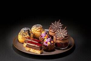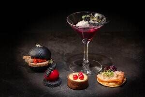 スイーツもセイボリーも、漆黒と深紅を基調とした色彩にまとめているのがポイント。まずスイーツでは、ベリーと濃厚なガナッシュが重なり合う「チョコレートと赤いベリーのタルト」、カシスを忍ばせた「カシスとマロンのモンブラン」、漆黒に染まる「シュークリーム」などを味わえる。