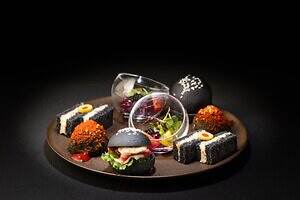 下段:生ハムとマスタードソースの黒いバーガー、黒の衣をまとったコロッケパプリカ風味、ブラックブリオッシュのズワイガニレムラードサンド、ロートコールとトマトジュレのサラダ キャビア添え