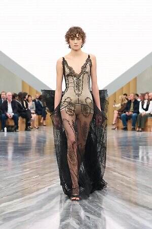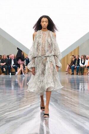 2025年6月に発表されたメンズコレクション同様、コレクション全体を通してメゾンの歴史に立ち返るようなルックが散見された。ムッシュ ディオールの1947年のデビューコレクションで登場し、時代を超えて愛されている名作「バー」ジャケットは、ウエストから広がる花びらのようなシルエットはそのままに、メンズウェアのファブリックで再解釈。鋭角的に張り出したフォルムのスカートが特徴的なデイ・ドレス「シガール」は、建築的な骨組みを活かしつつ、センシュアルなレースでナイトウェア的な官能性を引き出した。