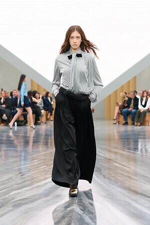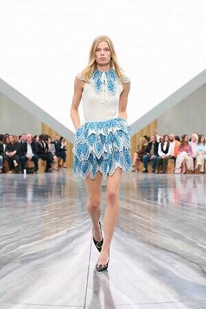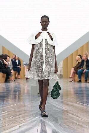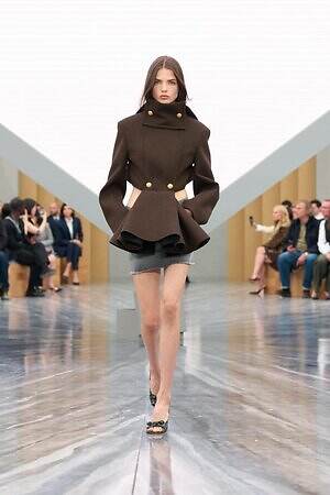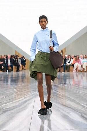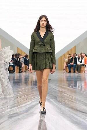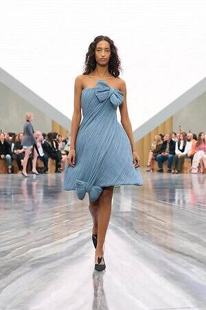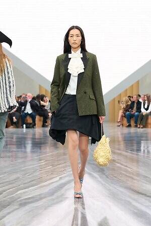 もちろん、ジョナサン・アンダーソンらしいエッセンスも随所に差し込まれている。編み込みディテールを配したひょうたん型のドレスは、実験的なフォルムを得意とするジョナサンならではのピース。ピークドラペルのピーコートは、硬さのある生地に折り目を入れることで、彫刻的なシルエットを形作っている。また、ジョナサンがアイルランド出身であることにちなみ、タータンチェックに彩られたタイ付きブラウスやミニスカートも登場した。