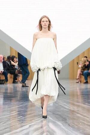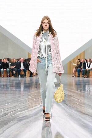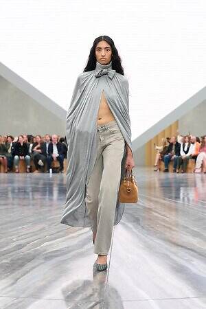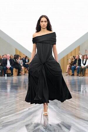 さらに、1949年オートクチュールコレクションで発表された、花びらのようなパーツが重なる「ジュノン」ドレスはホルターネックスタイルにアレンジ。パネルを重ねてボリュームを出した「デルフト」ドレスの構造はカーゴスカートに、「カプリス」ドレスの優美に流れるシルエットはデニムパンツに落とし込まれるなど、オートクチュールのヘリテージをカジュアルに昇華したピースも登場した。