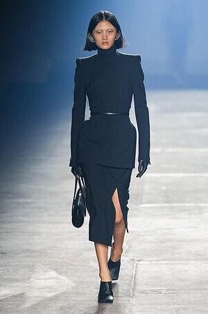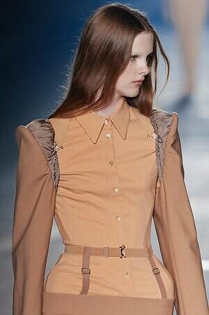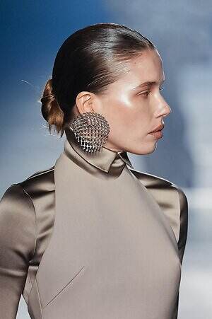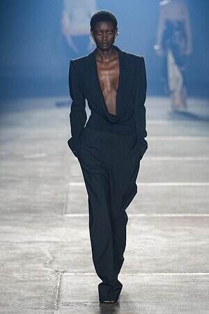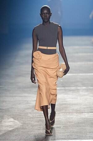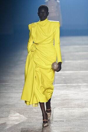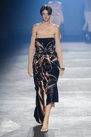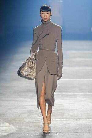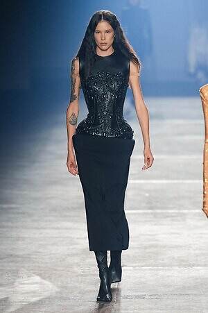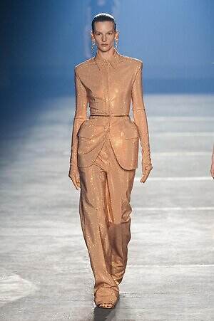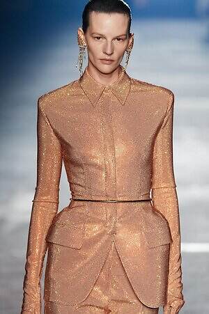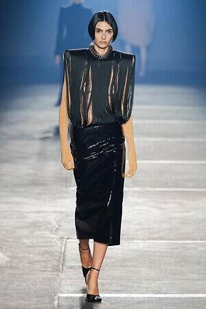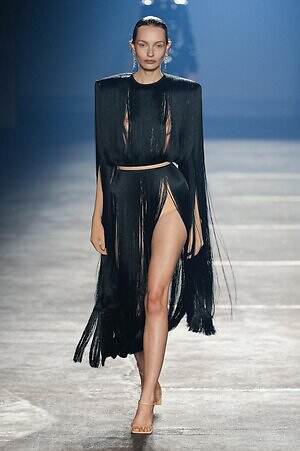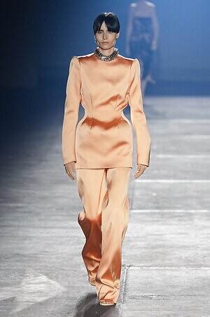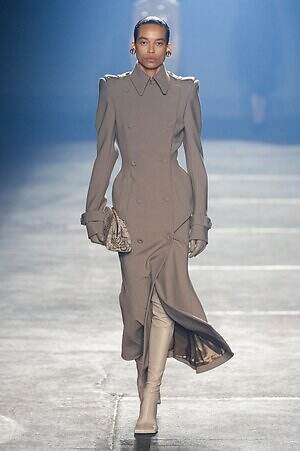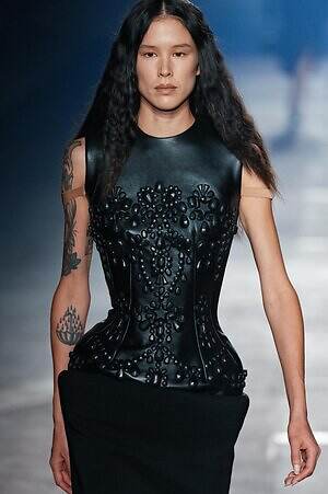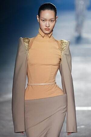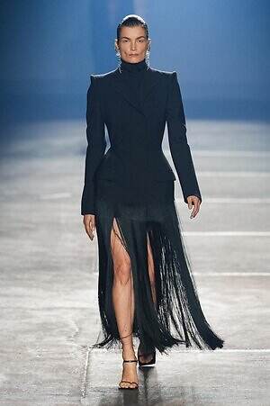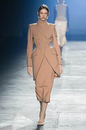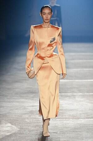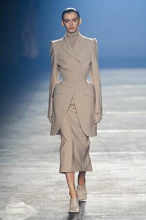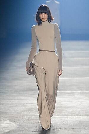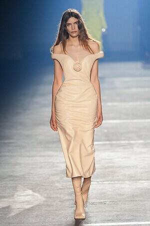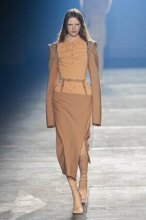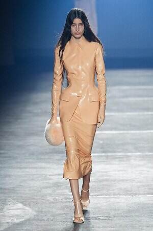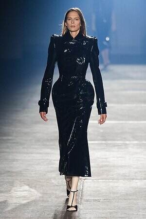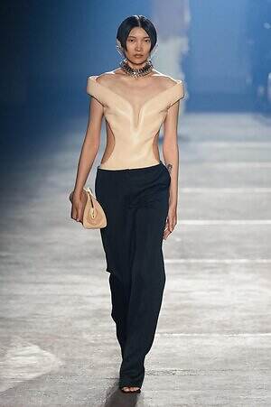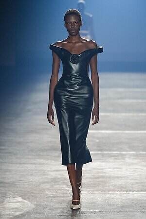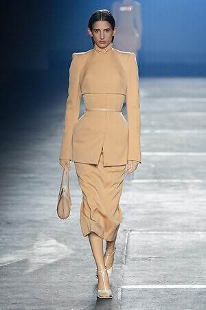 女性らしい体躯を引き立てる構築的なシェイプが特徴的だ。テーラリングはツンと張ったシャープなショルダーラインに、くびれたウエスト、ヒップを強調するフレアの裾を合わせ、規律的でありながらも色気を感じるシルエットに。シャツやドレスも同様に砂時計型のフォルムが取り入れられたほか、鎧のようにパワフルに女性を守るコルセット風のレザートップも登場した。