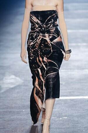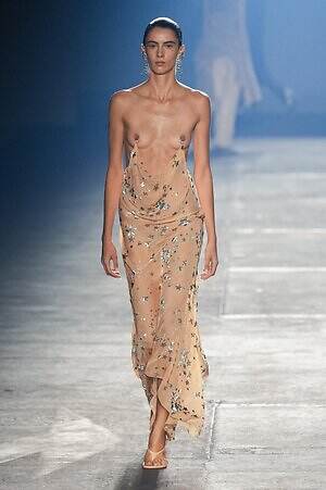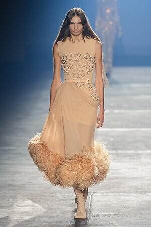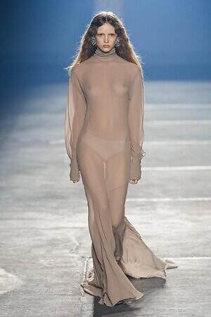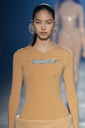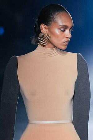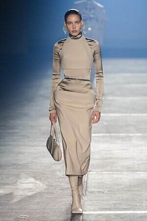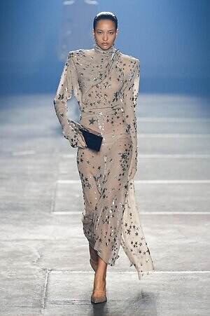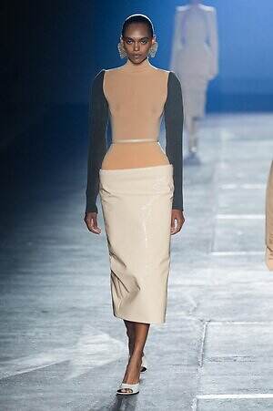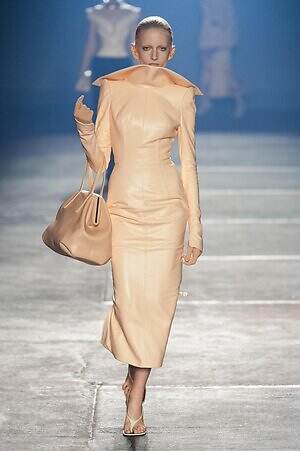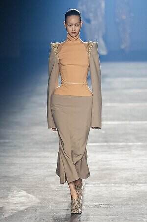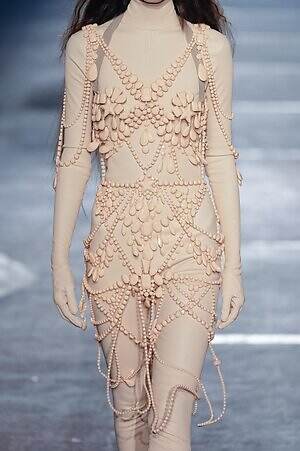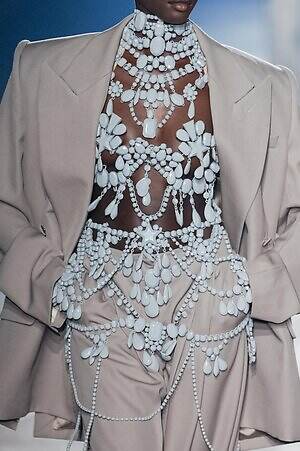 今季のミュグレーが描き出すのは、女性の内なる官能性。コレクション全体を通してヌーディーカラーが採用され、衣服と素肌の境界線をシームレスに溶け込ませた。