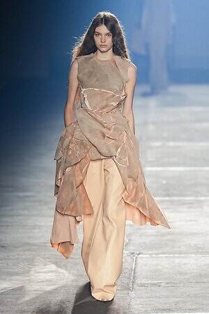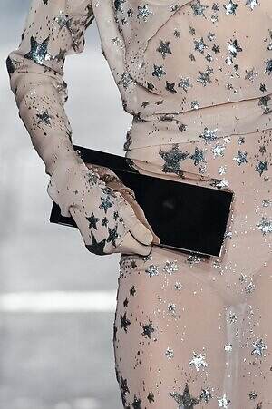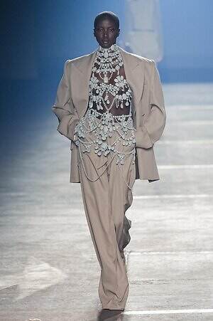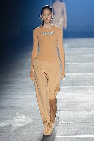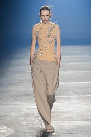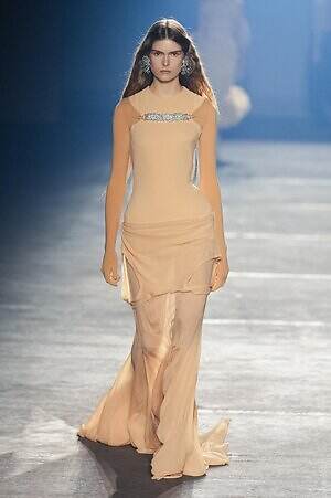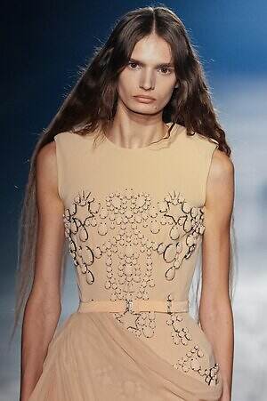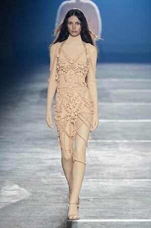 官能性を引き出すアプローチは、肌の存在をほのめかす極薄素材にも見ることができる。ヌーディーカラーのセカンドスキンは素肌となめらかに一体化し、シフォン素材のシアードレスやスカートとともに軽やかなセンシュアリティを演出。肌の上に浮かび上がるようにビジューやビーズの装飾を配したピースも散見され、ひんやりとした煌めきのアクセントを与えた。