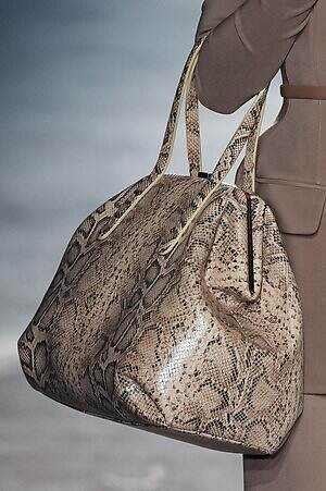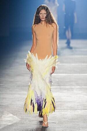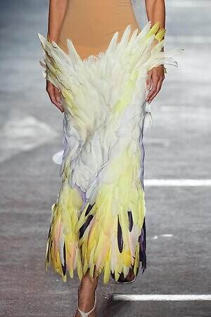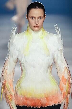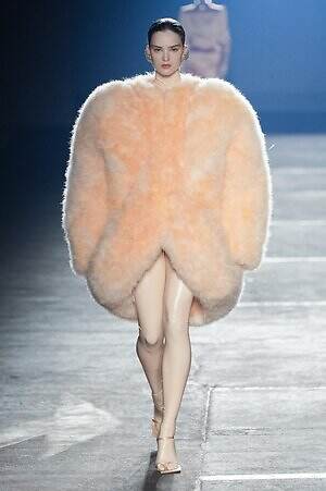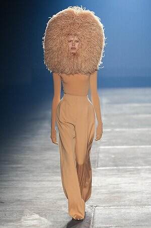 コレクションの中でもひときわ異彩を放っていたのが、ふわふわのフェザーを顔周りに纏い、着ぐるみのようなボリュームを演出したルック。このほかにも、鳥の羽をリアルに模したトップスや身体をすっぽりと包み込むファーコート、蛇柄のボストンバッグなど、動物を思わせるピースが散りばめられ、シームレスな洋服に遊び心をもたらしている。