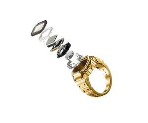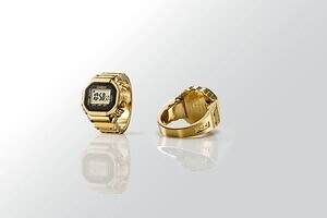 「CRW-001G」は、カシオの腕時計の機能と複雑な造形を指輪サイズで表現した指輪型デジタル時計だ。一般的な腕時計用モジュールと比較して、約1/10にダウンサイジングしている。