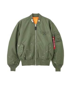 また、ホワイトベージュの染料が飛び散ったかのようなデザインをプラス。さらにカミヤのデザイナー神谷康司が日ごろMA-1を着る際にピンズでアレンジして着こなすことから、首元のリブ部分にはピンズをあしらっている。カラーは、スタンダードなブラックとカーキの2種類を展開する。