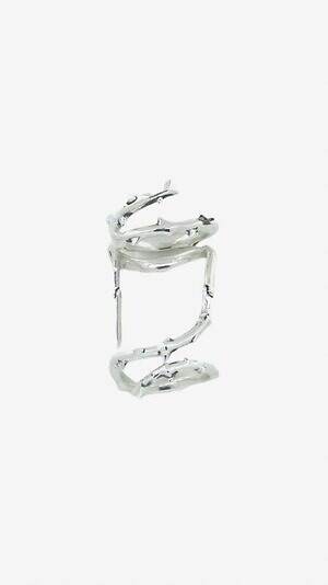 もう一方の「THORN WRAP RING」は、バラのつると棘に着想を得たリング。花言葉は“不幸中の幸い”で、ネガティブな状況の中にも希望を見出す意味が込められている。棘を立体的に造形したフォルムは、アーマーリングのような存在感を放つ。
