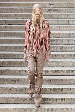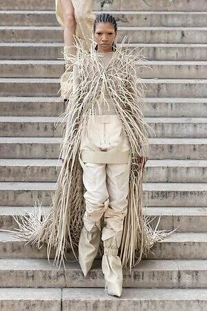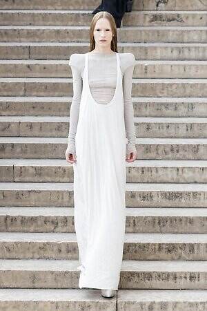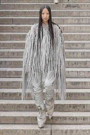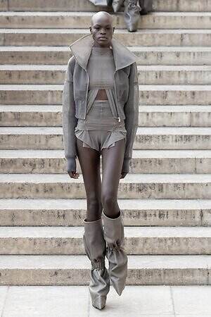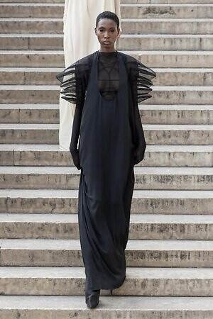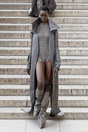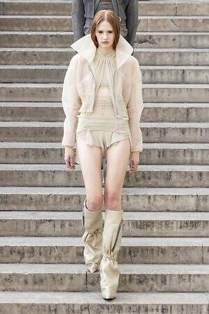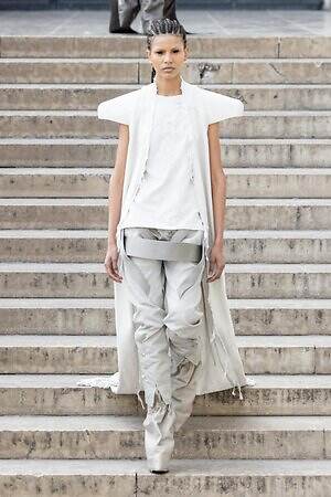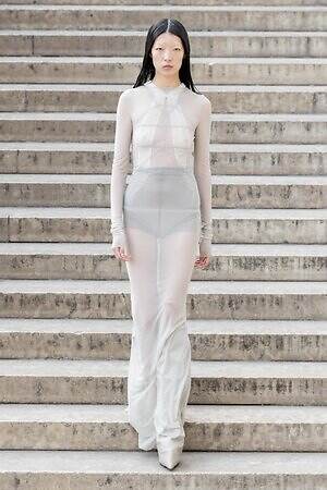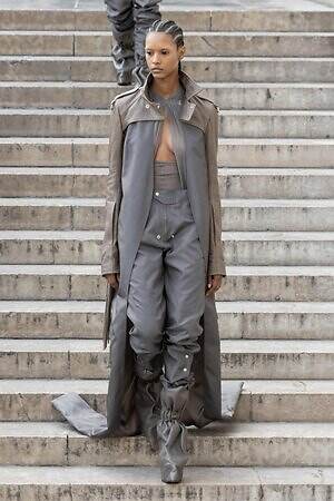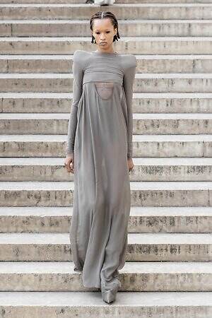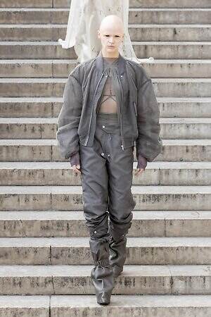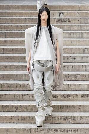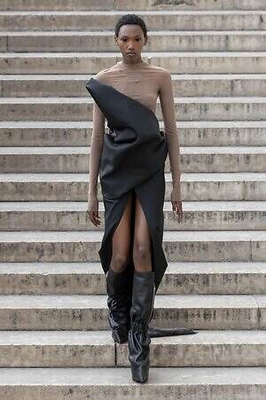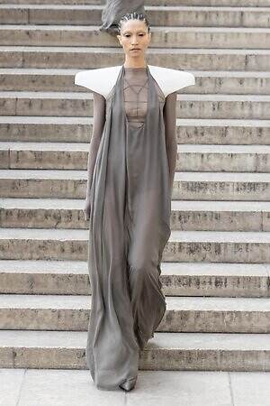ボディコンシャスなセカンドスキンが提案された一方で、身体を拡張するフォルムも登場した。リック・オウエンスのアイコンである張り出したショルダーパーツは今季も健在。また、ヨーロッパの洗練されたスタイルと、自身のルーツであるアメリカ的な大胆さを融合させた、工業用ナイロンを彫刻のようなフォルムに仕立てたドレスも目を引いた。