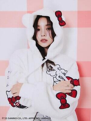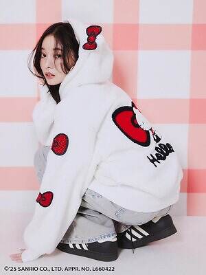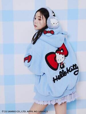 注目は、ハローキティ気分を楽しめるふわふわボアパーカー。ワッペンやタオル地のような柔らかな手触りのサガラ刺繍で、リボンやハローキティをたっぷり施した。リボンにあしらったキラキラのラインストーンもポイント。フードはハローキティの耳付きなので、かぶればハローキティになりきることができる。