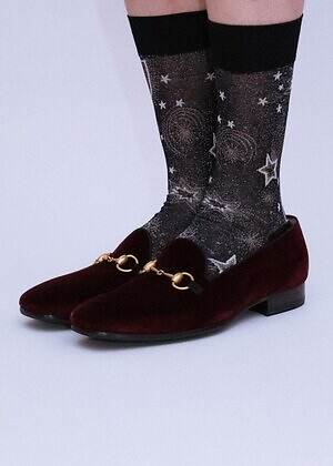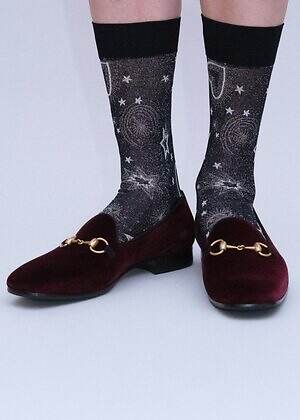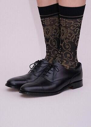 宇宙のように星を散りばめたデザインも登場。ベースとなるシースルー生地はダークトーンでまとめ、きらきらと星が浮かび上がる仕上がり。輝くラメ糸を織り込んでおり、足元に華やかな印象を添えてくれる。