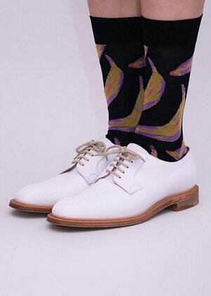 たとえば、バナナをモチーフにしたソックス。アンディ・ウォーホルが手がけた“バナナ”ジャケットを連想させる、ポップ・アートのような色使いがポイントだ。カラーは2種類で、ブラックの生地にはイエローのバナナ、チャコールグレーの生地にはブルーのバナナをあしらった。