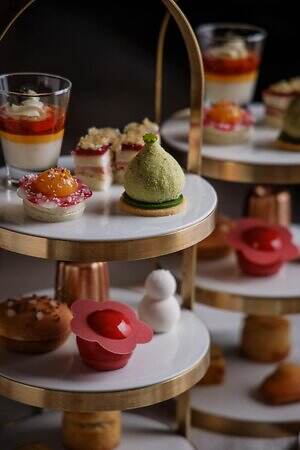 トリュフやキャビアといった高級食材を用いたセイボリーも必見。ツリー型に仕上げた「チキンとマッシュポテトのショーフロア」や「トリュフミートパイ」、キャビアとロブスターがのった「フロマージュブランと人参のヴェリーヌ」、「ポークハムとコンテチーズのサンドイッチ」など、満足感たっぷりのメニューを用意する。