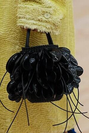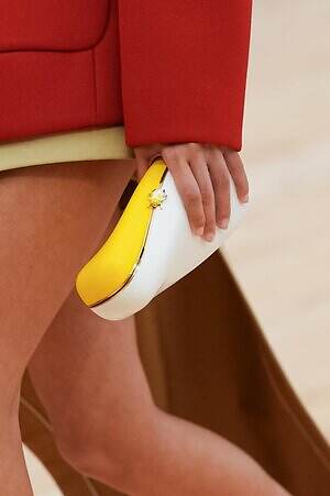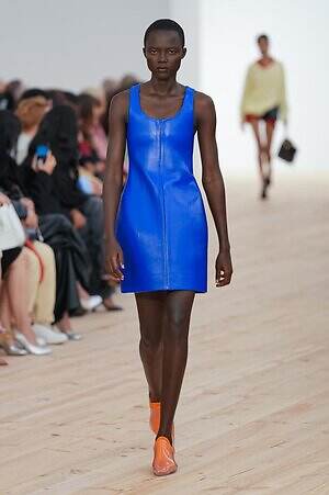 ロエベを象徴するレザーは、ウエストから裾にかけてふっくらと丸みを帯びたミニドレスやノーカラージャケットへと昇華。ハリと光沢を湛えた独自の質感が、プラスチックでできたおもちゃの人形のような、構築的なフォルムを生み出している。シャープなテーラリングもまた、ウエストをダイナミックにシェイプし、肉厚なファブリックを用いて彫刻的な形状をキープした。