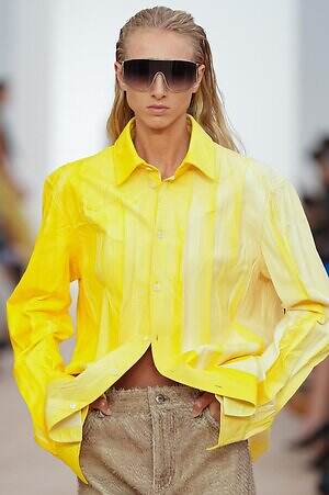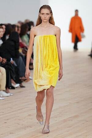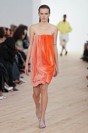 ミニマルなピースにエッジを加えるのが、起毛感のあるテキスタイルだ。チューブトップのドレスには、ほのかに光沢を纏ったパイル地を採用し、お風呂上がりにバスタオルを巻いてそのまま出てきたかのような抜け感を演出。ステンカラーコートやカラーデニムには毛羽だった加工を施し、テクスチャーの遊びを加えている。カラーにはオレンジ、イエロー、ブルー、グリーンといった鮮烈かつ大胆なパレットが用いられ、視覚・触覚ともに楽しさをプラスした。