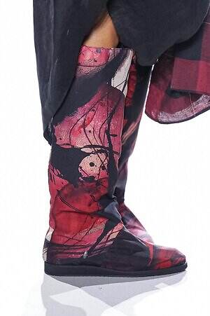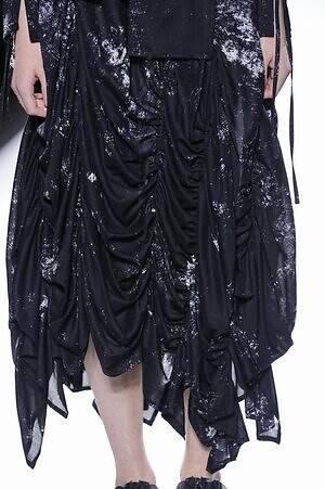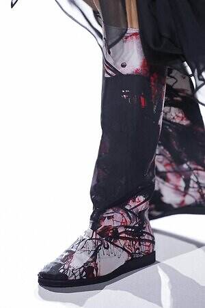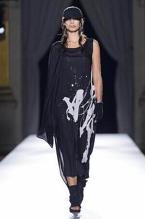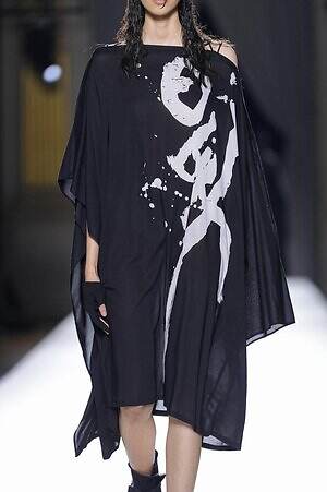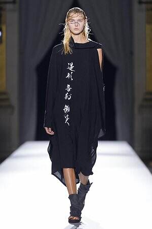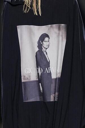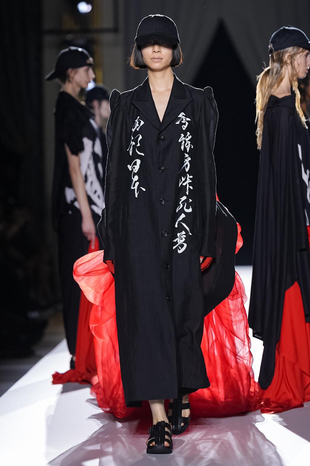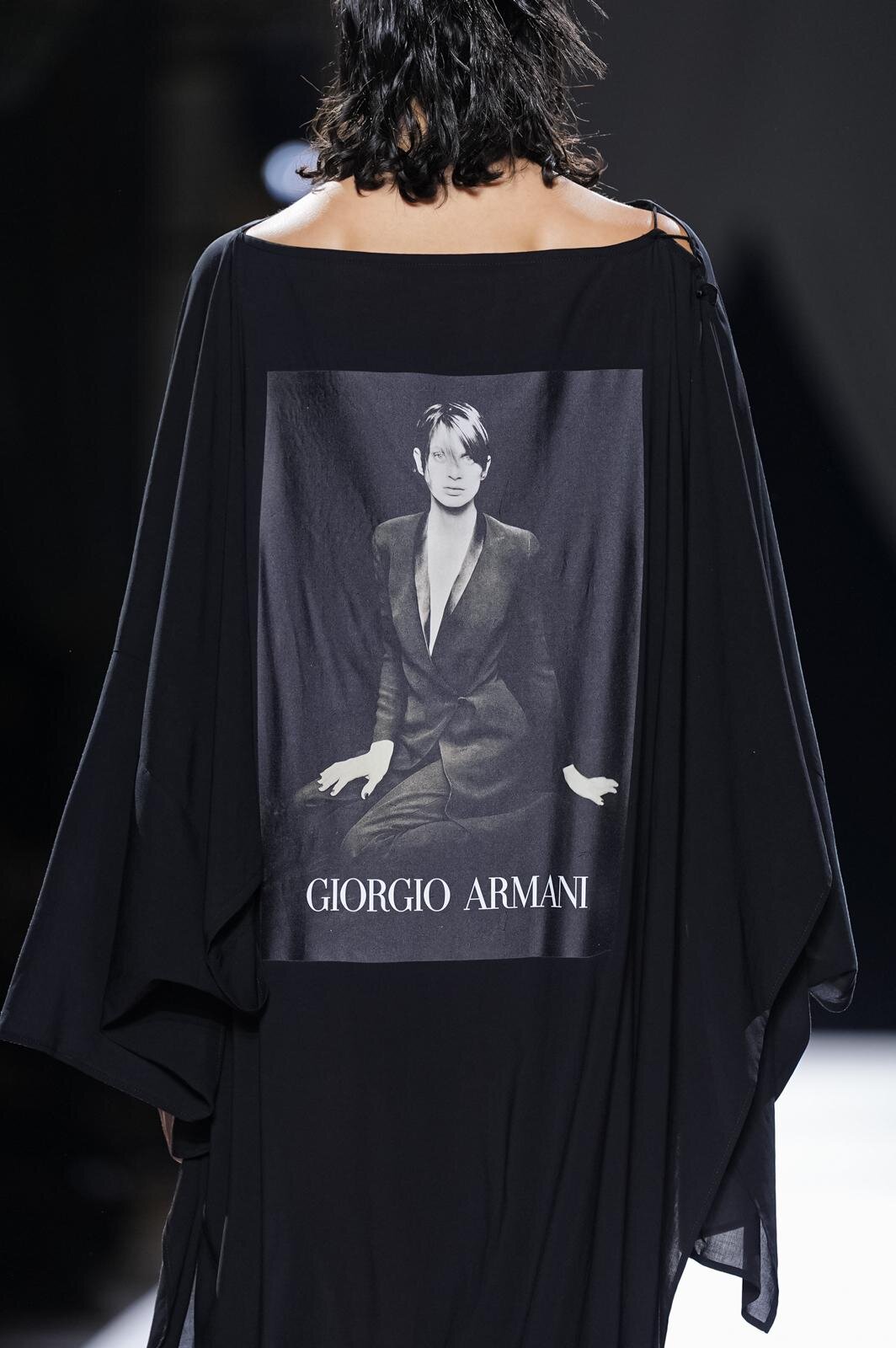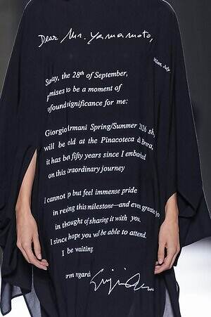 また、山本耀司の友人であり、モードの帝王としてファッション界を牽引してきたジョルジオ・アルマーニがコレクション発表の約1ヵ月前に亡くなったことを受け、彼を追悼するようなピースも登場した。穏やかに流れるシアーなブラックケープには、バックにジョルジオ アルマーニのポスターグラフィックをオン。フロントには、山本耀司、ジョルジオ・アルマーニ両者のサインとメッセージをあしらっている。