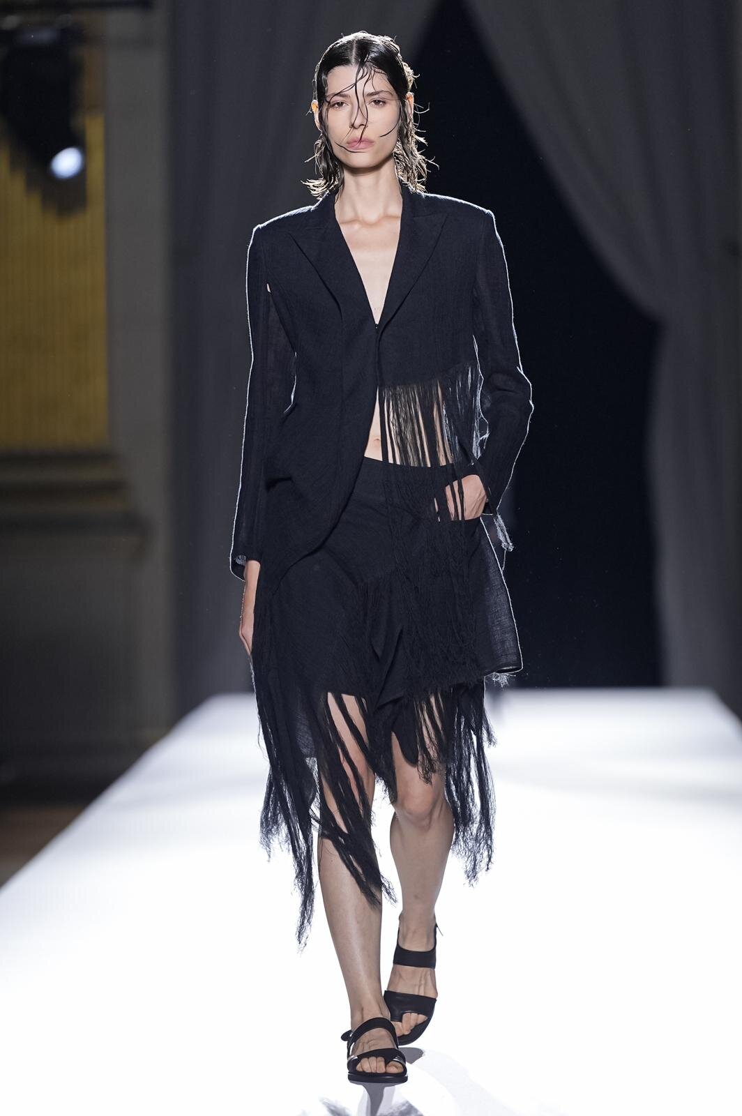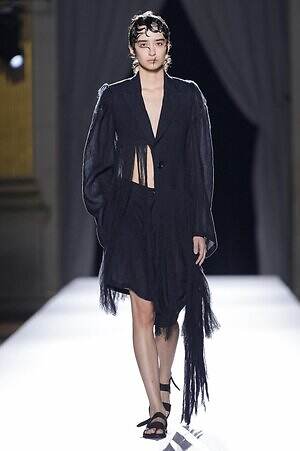柔らかな風合いのテーラードジャケットやミニスカートは、経年変化により生地がほどけているようだ。ぼろぼろになって解体された部分からはゆったりと糸が垂れ、モデルの動きに合わせてしなやかに躍動。同時にほんのり素肌を透かし、脆く儚げなムードをもたらしている。