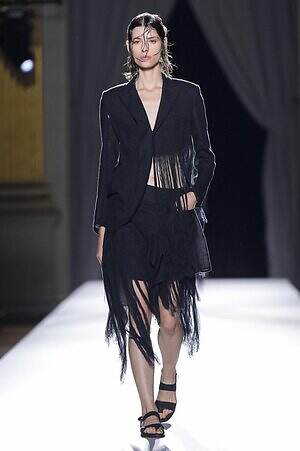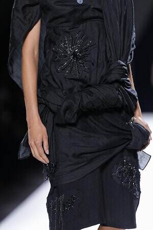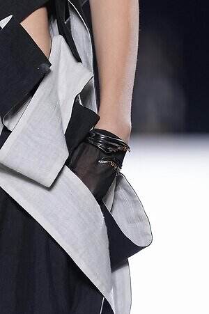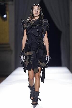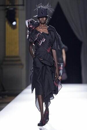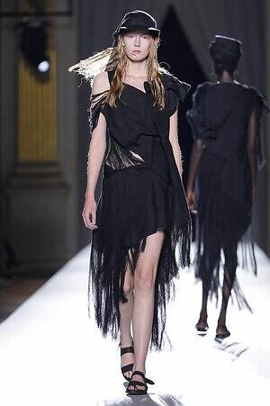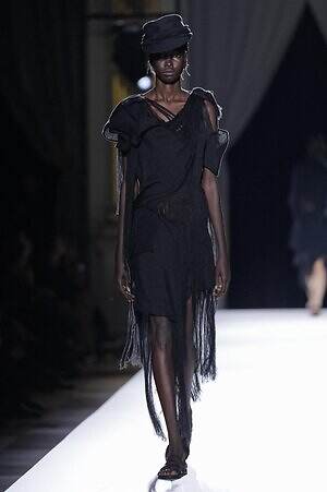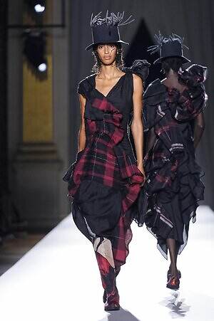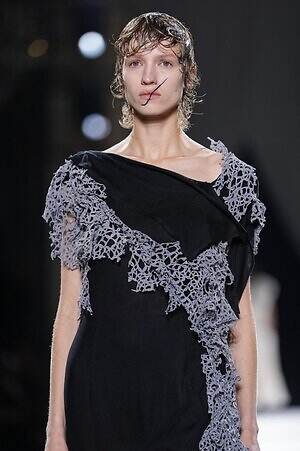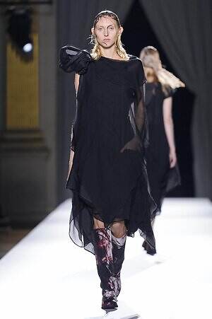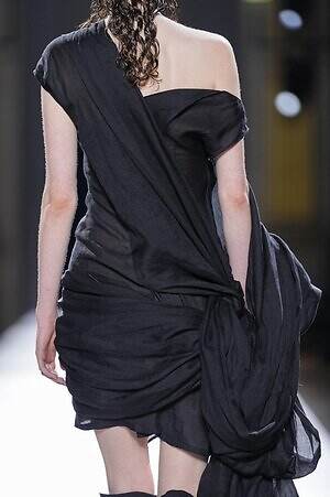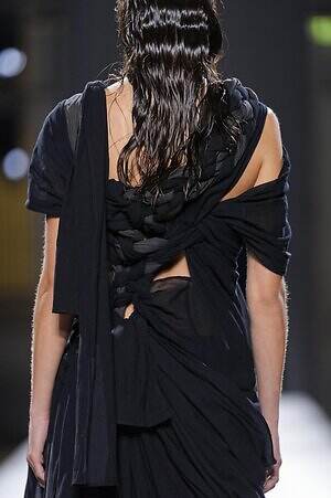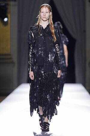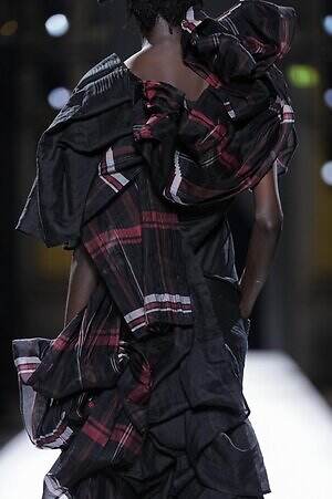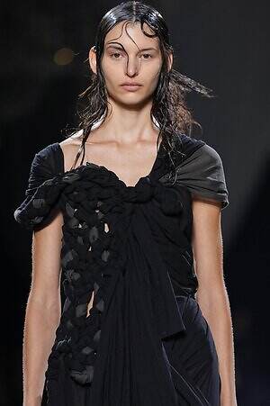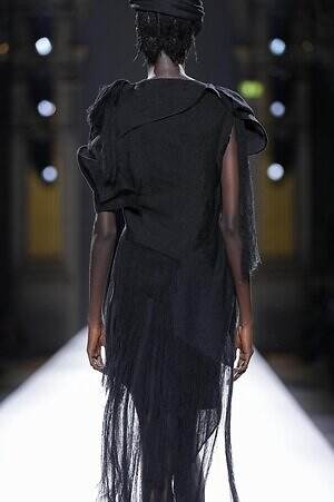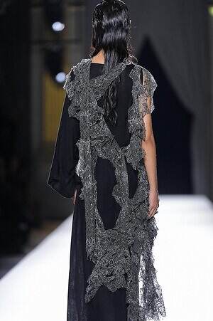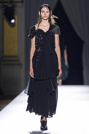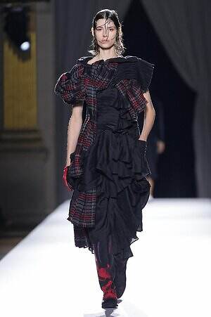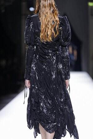 フィナーレに向けて、目の覚めるような赤のロングコートやマントを纏ったモデルが次々に登場。ランウェイを歩きながらアウターを脱ぎ、再び黒の世界へと戻る演出が披露された。そしてラストルックには、1986年のアーカイブを彷彿とさせる、バラを思わせる真っ赤な布地をあしらったコートを披露。モデルは鮮烈な赤を引きずりながらゆっくりと歩みを進め、ドラマティックにコレクションを締めくくった。