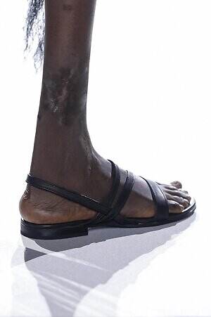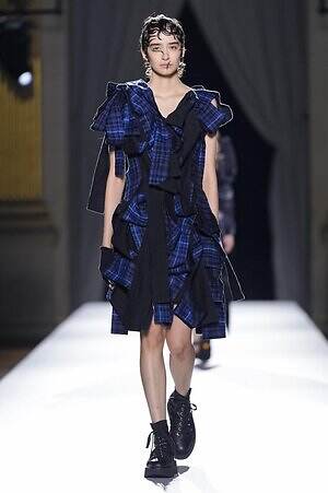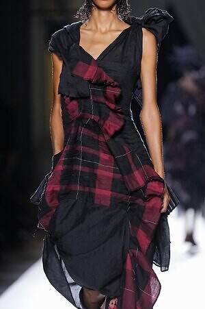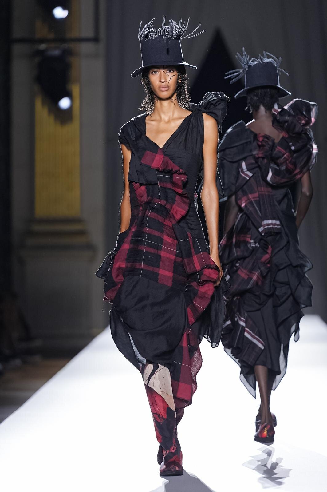 ドレスはそのほとんどが左右非対称に仕立てられている。たとえば落ち感のあるシンプルなシアードレスは、片方はノースリーブ、もう片方はケープ状と異なるスリーブデザインを採用。赤のチェックを差し込んだドレスは、フロントを横断するように大ぶりのフリルをあしらい、スカートの重量感も片側のみに寄せていた。一見偶発的なフォルムにも見えるが絶妙なバランスで成り立っており、高度なパターンメイキングの技術を見て取ることができる。