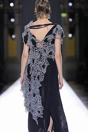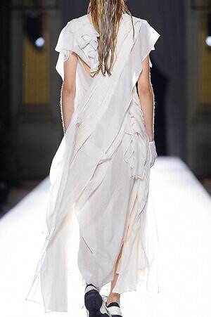 “やさしさ”を形作っている要素のひとつは、流れるような布地の動きだ。分量を持たせたロングドレスは、生地を結んだり、編み込んだりしながら緩やかなドレープを演出。ゆったりと身体を包み込むケープドレスはシアー素材を幾重にも重ねて優雅さを漂わせるとともに、布地を贅沢につまんで花のモチーフを咲かせている。